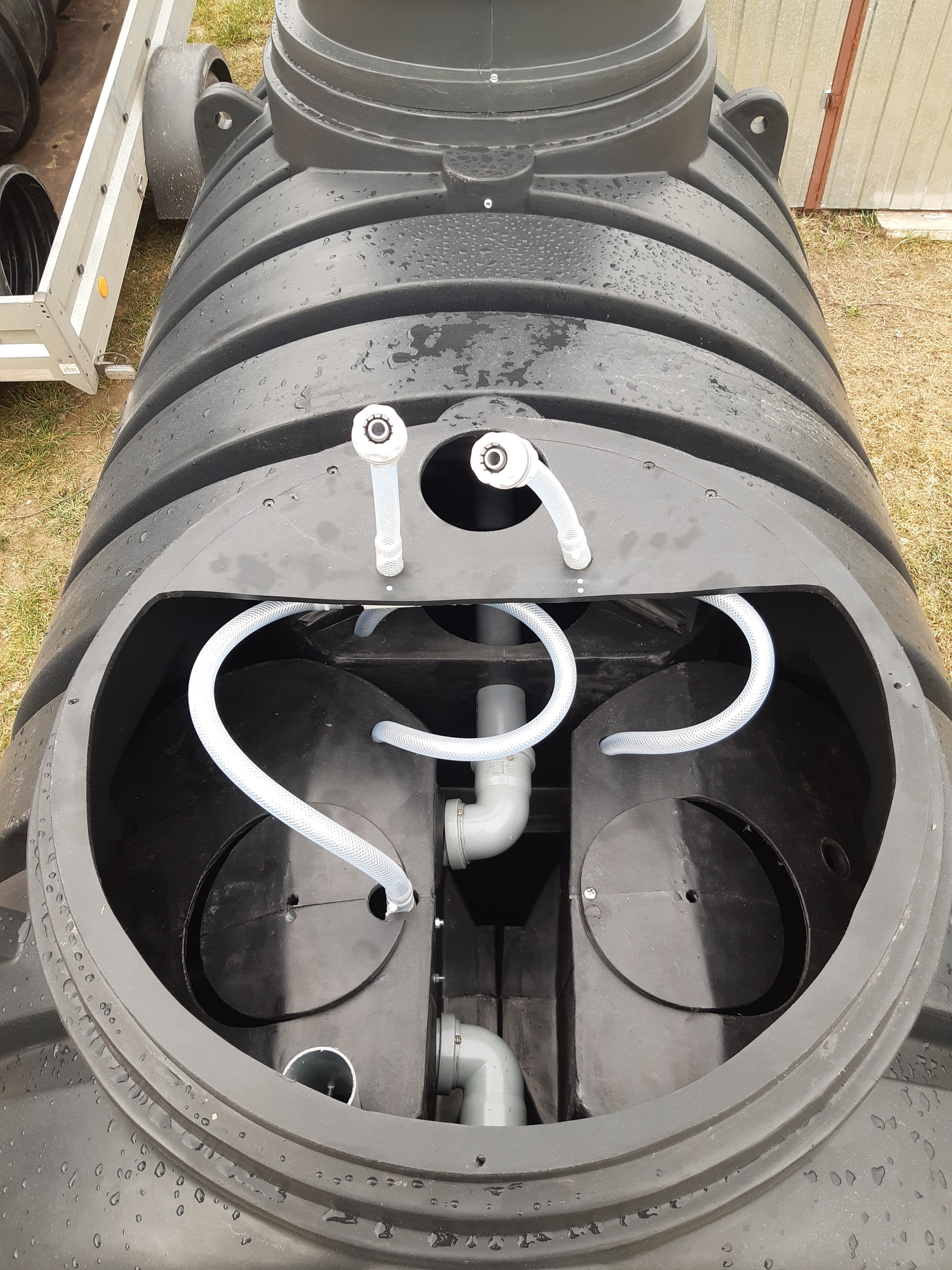 Sterownik i dmuchawa są zainstalowane w szafce technicznej, która zabezpiecza je przed zalaniem przez ściekii przed warunkami atmosferycznymi. Powietrze potrzebne do pracy oczyszczalni jest podawane z szafki technicznej elastycznymi przewodami.