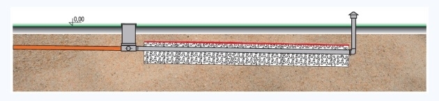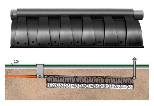 Wykonane ze studzienki zbierającej oczyszczone ścieki i rozdzielającej je na poszczególne nitki drenażu oraz z rur pcv wyposażonych w szczeliny rozprowadzające. Całość zanorzona w kamieniu otoczaku płukanym i okryta geowłókniną celem zabezpieczenia złoża przed przedostaniem się cząsteczek gruntu.